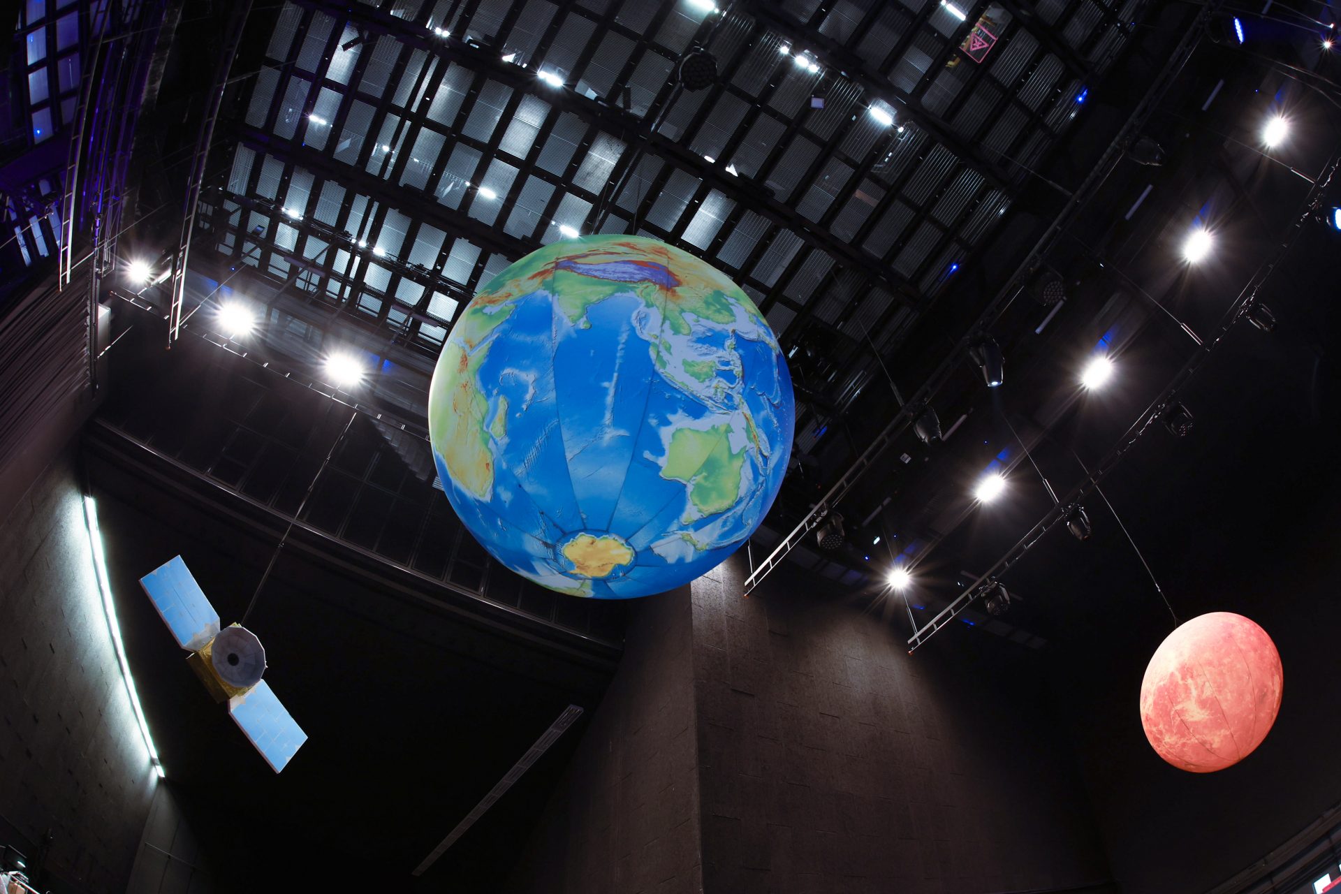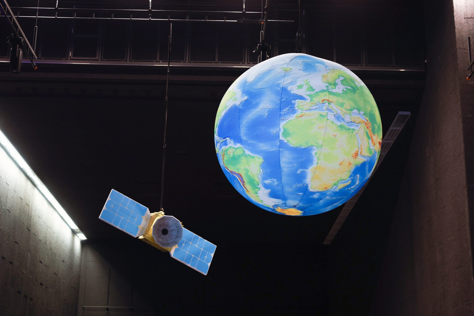 Au cœur du dispositif, deux pièces maîtresses entièrement fabriquées dans nos ateliers en carton alvéolaire Re-Board : un vaisseau spatial grand format monté sur socle, aux détails graphiques soignés, et une réplique de satellite suspendu aux panneaux solaires imprimés avec précision. Légers, rigides et éco-responsables, ces éléments de décor volumétriques illustrent parfaitement le potentiel créatif du Re-Board appliqué à l’événementiel d’entreprise.
