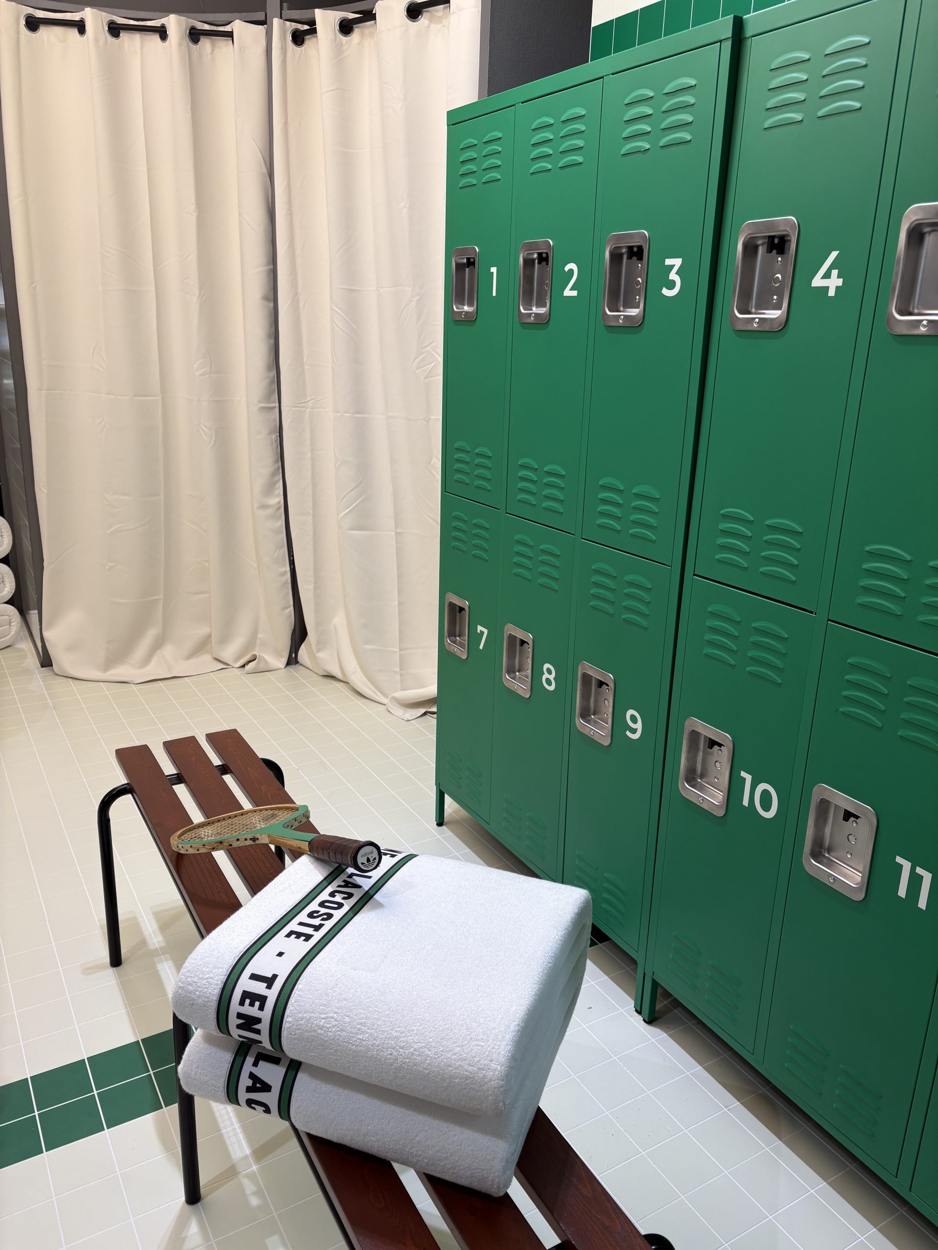 L’ambiance vestiaire club, sobre, élégante et fidèle à l’ADN de la marque, prend vie grâce à plusieurs solutions d’habillage réalisées dans nos ateliers de Maxéville : adhésif sol effet carrelage vert et blanc, habillage mural en grand format, vitrophanie « Tennis for Everyone » en devanture de boutique, et panneau logo rond apposé en fond de scène.